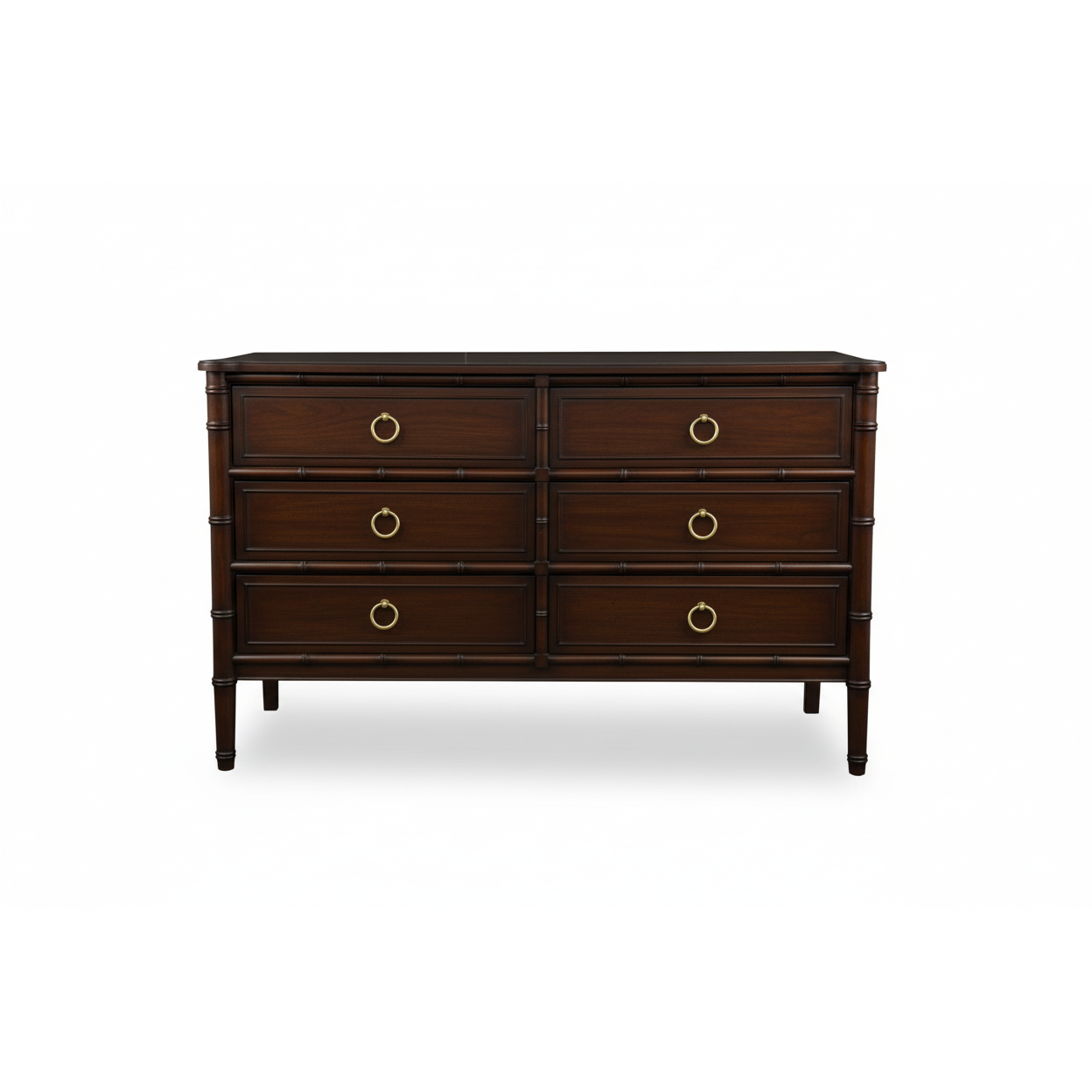 This Chinese Chippendale–inspired faux bamboo six-drawer nightstand features sculpted bamboo-style detailing and a refined silhouette, offering timeless elegance and functional bedside storage..